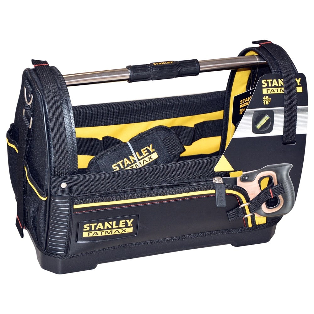 The Stanley 1-93-951 FatMax open tote tool Bag has multiple use tool compartments for all your storage needs with easy access pockets. Comes complete with heavy duty steel handle. Features: Heavy duty 600 denier fabric with leather reinforcements for long lasting durability Rigid and waterproof plastic base Heavy duty steel handle bar Shoulder strap - allows easier carrying of heavy loads Velcro straps - ideal for securing a 600mm level Multiple use tool compartments for all storage needs with easy access pockets. Side cutting compartment, adjustable in size; Large cable tray side; Holder for tape measures