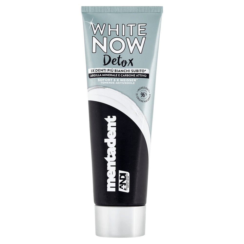 Mentadent White Now 3X Detox toothpaste 75 ml, is a whitening or cleaning toothpaste based on clay and activated charcoal. The teeth will be whiter thanks to the mineral clay and activated carbon that naturally removes stains while remaining gentle on the enamel. Its clinically tested formula is enriched with correct white technology for whiter teeth instantly. With whitening ingredients of natural origin.