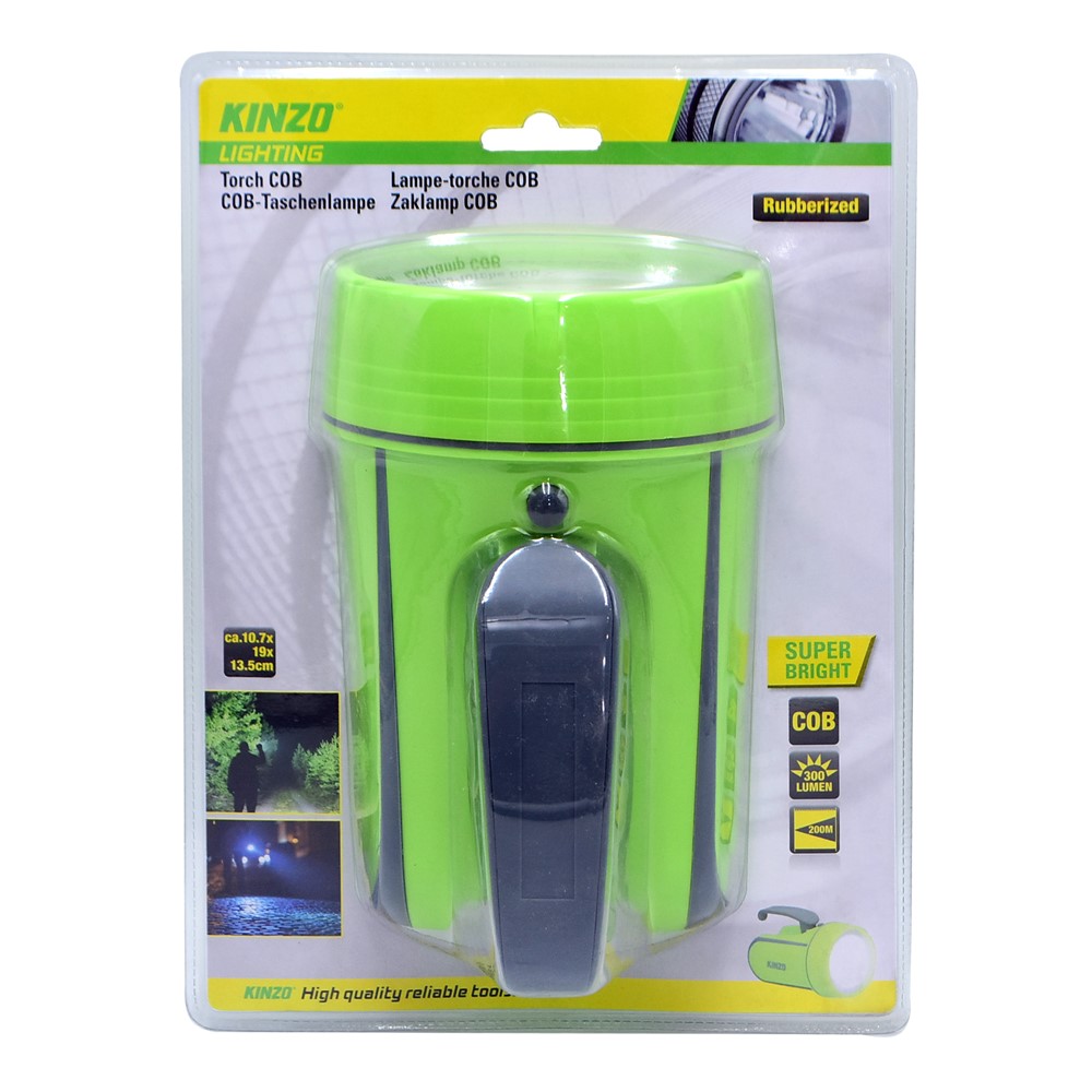 Portable flashlight, Kinzo, with a structure made of plastic material, with dimensions of 10.7x19x13.5 cm, in green and gray color, with an ergonomically shaped handle with a coating made of soft rubber material, which makes it easier to hold during use. The flashlight operates with a LED lamp, with a power of 3 W, with a light emission output of 300 lumens and an illumination length of up to 200 m. This product can be used for indoor or outdoor lighting and it is suitable for use as a necessary accessory on nature fieldtrips or camping trips.