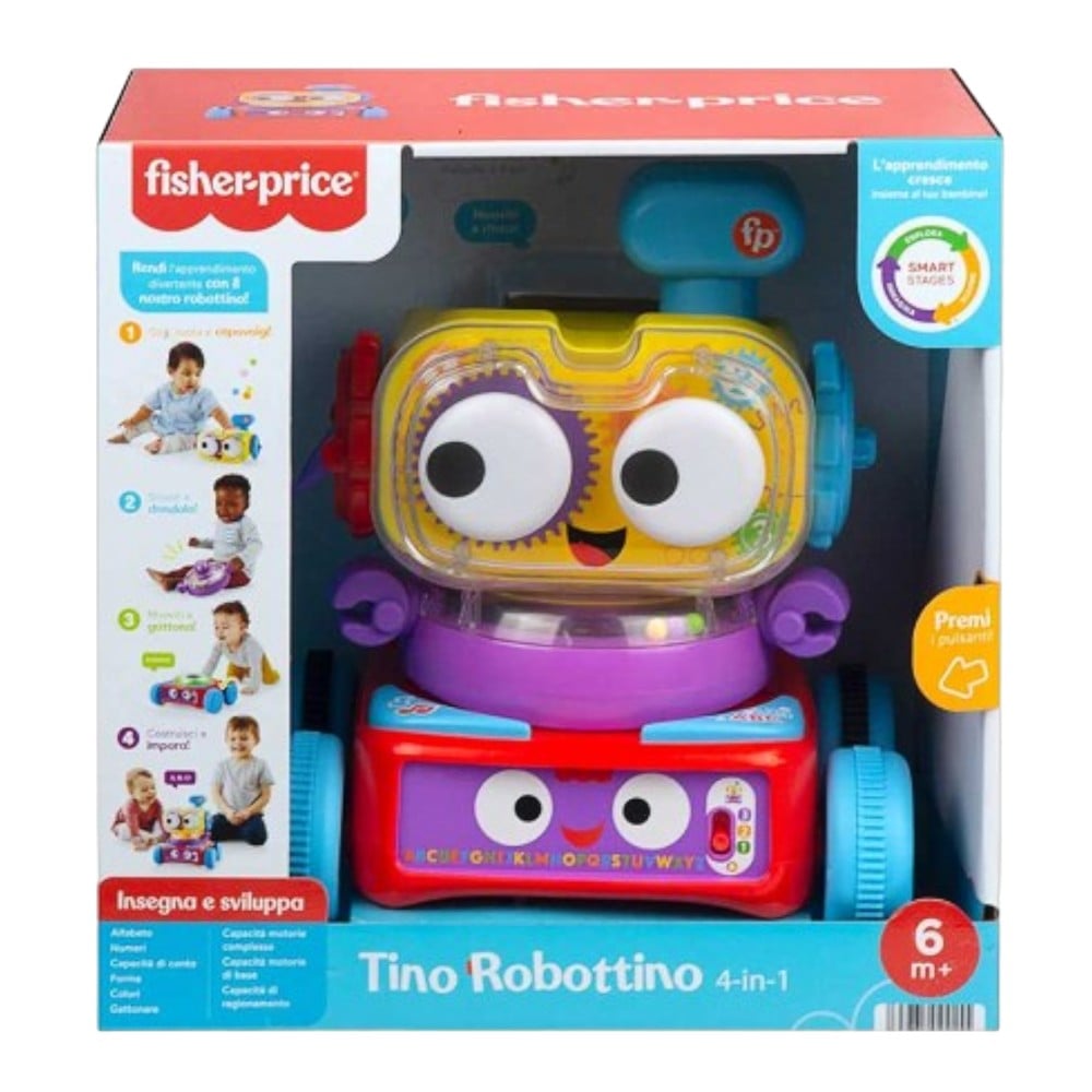 4 toys in 1 to follow the child's growth during play, from newborn to the first steps phase and finally to pre-school age (6 months and up). Each part of the robot offers tons of fun activities for little ones to explore. Put them all together to build an interactive electronic robot friend! Press any button on the motorized robot to make it dart through music and lights, encouraging baby to crawl and chase it. Lots of hands-on activities for babies who can sit, such as a pushable antenna, ears that swivel and bend and a base that rocks by staking it with a rattle. 3 Smart Stages learning levels with over 120 melodies, sounds and phrases about numbers, counting, the alphabet, shapes, colors and more.