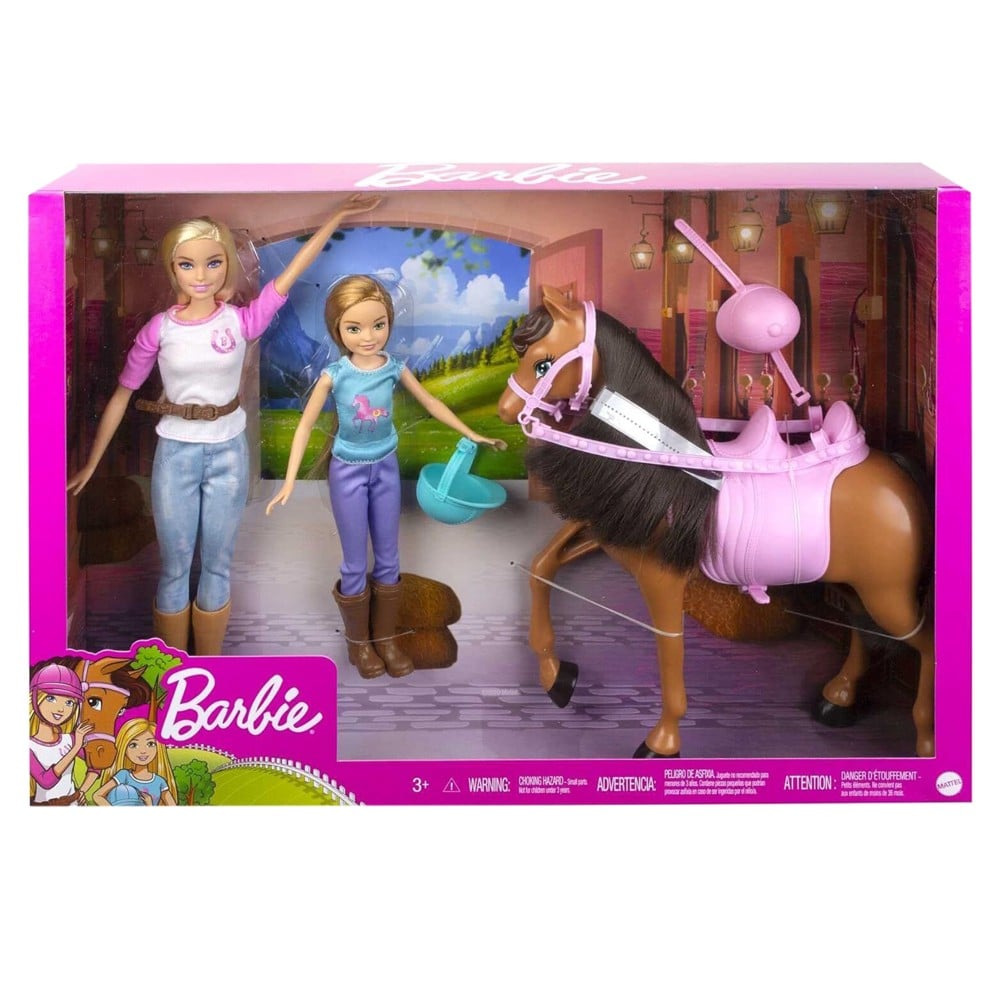 Get ready for adventures with Barbie doll, little sister Stacie and their adorable horse. Ready for a day of riding, each doll wears a casual outfit with a matching helmet and riding boots. Their horse has a two-seat saddle so the sisters can switch or ride together.