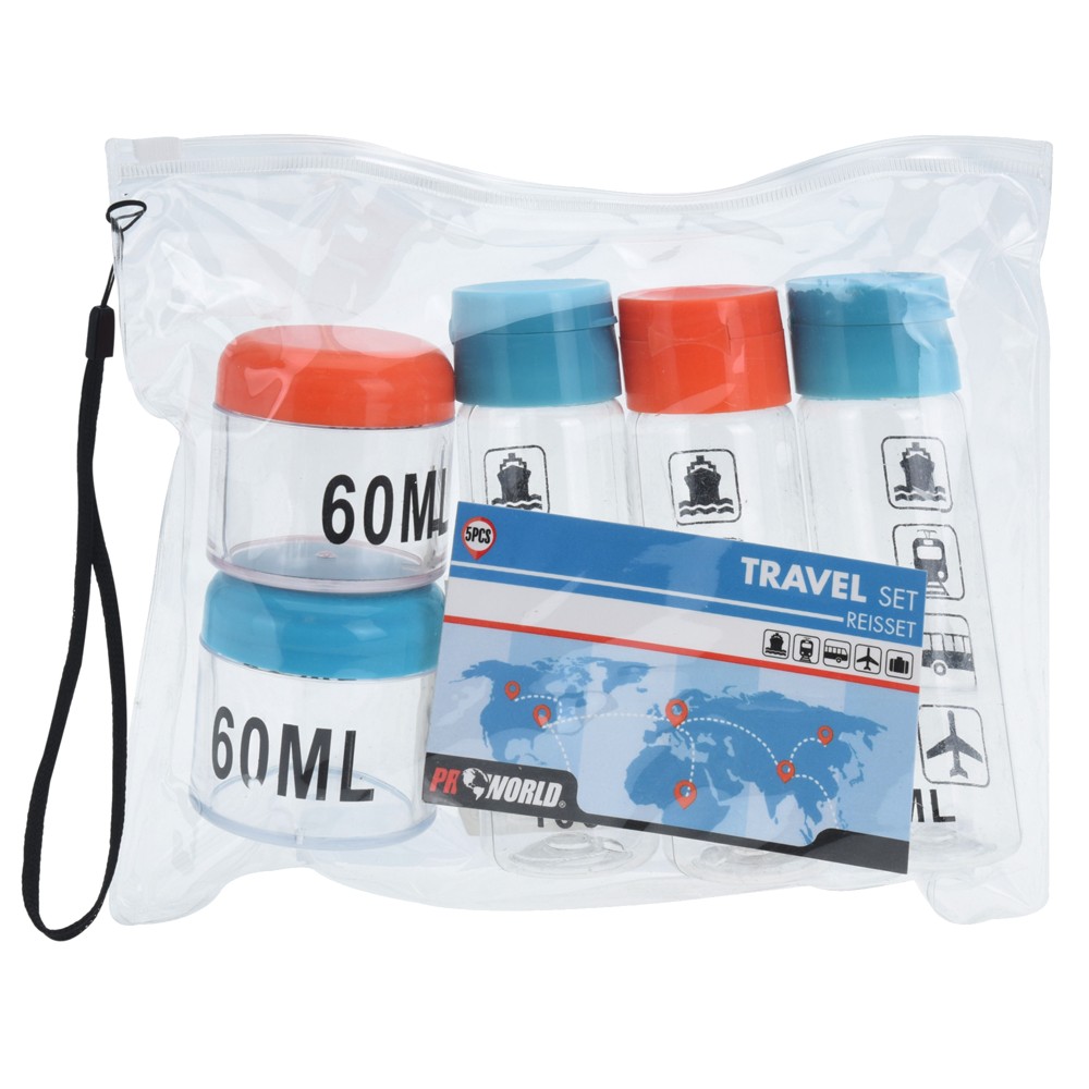 Set of transparent bottles, for shampoo, conditioner and body lotion, made of transparent plastic material. They are used to carefully store various personal care products and are convenient and practical for long trips. The set contains 3 bottles with a capacity of 100 ml and 2 jars with a capacity of 60 ml.