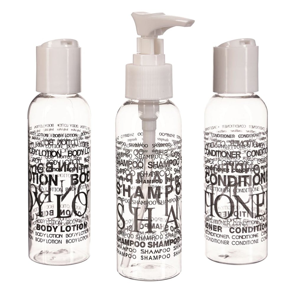Transparent bottles set, for shampoo, conditioner and body lotion, made of transparent plastic material. The bottles are used to carefully store various personal care products and are convenient and practical for long trips. The set contains 1 spray bottle and 2 normal bottles.