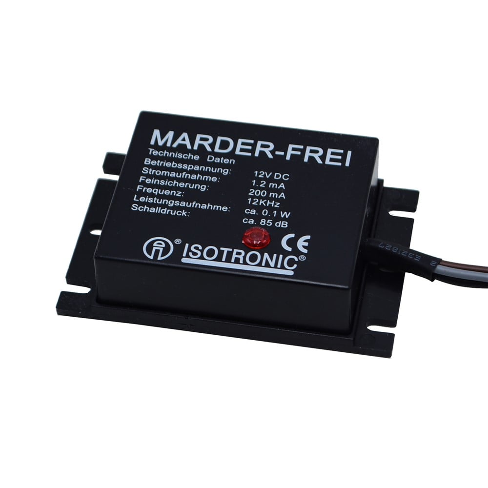 Ultrasonic mouse / beaver remover for car Marder Frei 78405. Operating voltage is 12 V DC. This remover removes rats and beavers. It has a current of 7 mA and a power of 0.1 W. The noise level is 85 dB at a frequency of 12 kHz. It has a coverage angle of 160 °.
