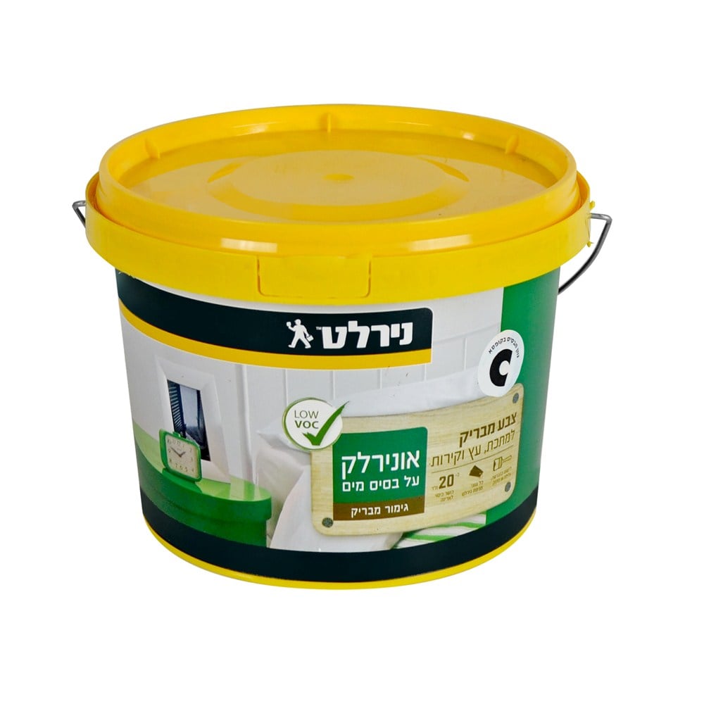 Unirlaque Water based 3 L . A high quality enamel paint that can be applied on every wooden, wall and metal surface, intended for both, interior and exterior use. Glossy topcoat based on selected synthetic resins. Bears Israel Standards Mark 765. Intended for painting metal, wood and walls after suitable preparation and application of primer. Special Features: High gloss, maximal flexibility,high durability under exterior conditions, doesn’t contain lead, spreads very well when applied by brush, intended for decorative painting on top of a suitable primer. Thinner: Dilution quantity (by volume) up to Brush 5%, rolle 5%, sprayer 20%. Shades In RAL shades or according to the Nirlat Millennium color fan. Gloss High, Theoretical coverage (m2/l) Approximately 12, depending on shade. Dry to touch 2-3 hours Dry to recoat 24 hours.