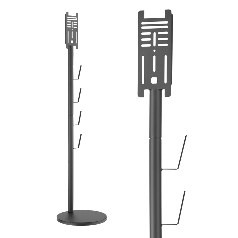 Universal Vacuum Cleaner Stand. An elegant and sturdy floor stand that optimizes space, keeps the vacuum cleaner and its accessories organized, and always within reach. Universal, compatible with all stick vacuum cleaners. Slim, space-saving design. Hooks for storing accessories. Wide, solid base for anti-tip stability. High load capacity. Cold-rolled steel.