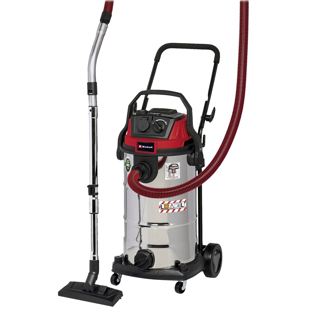 The Einhell TE-VC 2340 SACL wet and dry vacuum cleaner is a high-quality, powerful 1500 W ECO vacuum cleaner for L-class dust, in accordance with European standards. The wet and dry vacuum offers good service for careful cleaning of surfaces that are not sensitive to water. Unlike normal vacuuming and mopping, the wet and dry vacuum provides deep and thorough cleaning and is an ideal addition to standard household cleaning equipment when it comes to tough, ingrained dirt. As it filters fine dust, the wet and dry vacuum is particularly suitable for allergy sufferers. The filter cleaning system restores suction power. The suction power is infinitely adjustable using the speed controller and the blow attachment is suitable for blow cleaning of hard to reach areas. Even for ambitious "DIY" enthusiasts, a wet and dry vacuum is a practical helper for cleaning tasks on the construction site, in the workplace or in the hobby room: It has an integral automatic coupling plug (230 V, max. 2,180 W ) for connecting power tools for DIY work. The robust, rust-proof stainless steel tank has a capacity of 40 litres. To enable the absorbed water to drain easily, there is a drain screw. For easy transport, there are large wheels and castors and a trolley handle, as well as a cable reel and suction tube holder are built into the housing. A practical accessory holder means nozzles are always ready to hand and ensures tidy storage of spacious accessories. The product is supplied complete with a stainless steel telescopic tube (Ø 36 mm) with air regulator, a heavy-duty 3 meter plastic suction tube (Ø 36 mm), a large combination, slotted and upholstery nozzles, plus a folded filter, a foam filter and a bag of synthetic dust.