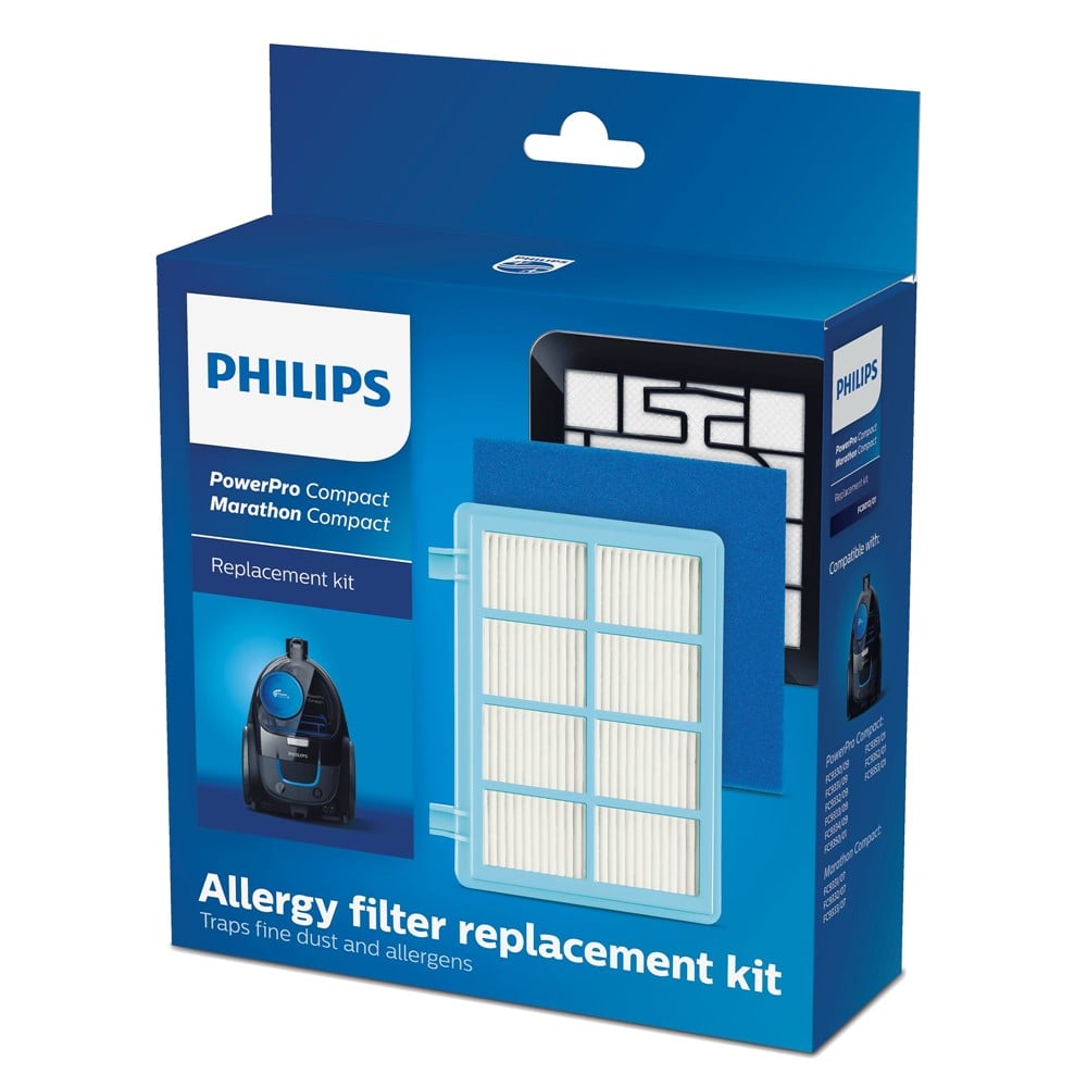 Set of replacement anti-allergic filters for PowerPro Compact and Active vacuum cleaners. Kit contents: anti-allergic outlet filter: 1x, washable engine inlet filter: 1x, washable engine foam filter: 1x. All filters must be replaced once a year. Suitable for vacuum cleaners: PowerPro Compact: FC9330, FC9331, FC9332, FC9333, FC9334, FC9350, FC9351, FC9352, FC9353