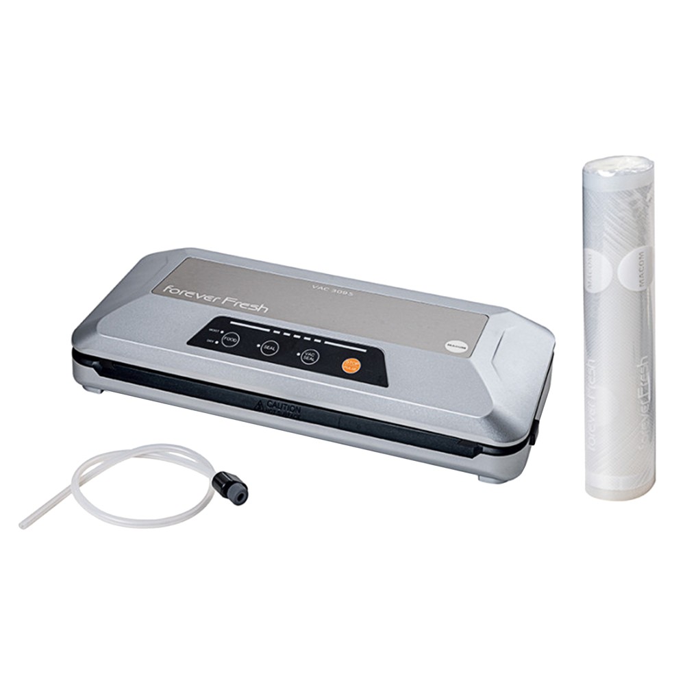 Automatic vacuum machine. With roll holder and cutter, to create bags in the desired size, without wasting material. Selector for packaging wet / cecchi food. The "Pulse" function allows you to control the air intake by favoring the packaging of foods, even the most crumbly. Double size sealing bar that ensures an airtight seal. LED lights indicate the progress of operations. Function to perform the vacuum with the containers.