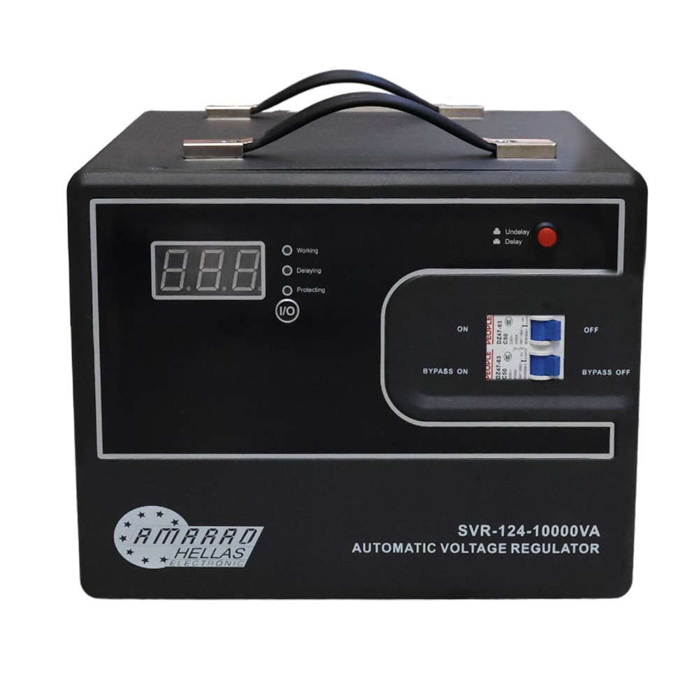The Amarad voltage stabilizer is designed to maintain a stable single-phase voltage in the event of mains voltage deviation over a wide range of values and duration. The possibility of continuous control of the input and output voltage is provided by the presence of a multifunctional digital display. This stabilizer has a power of 10 kVA (6000 W). The input voltage is 140V-260V AC 50/60Hz and the output is 220V AC 50/60Hz ±8%.