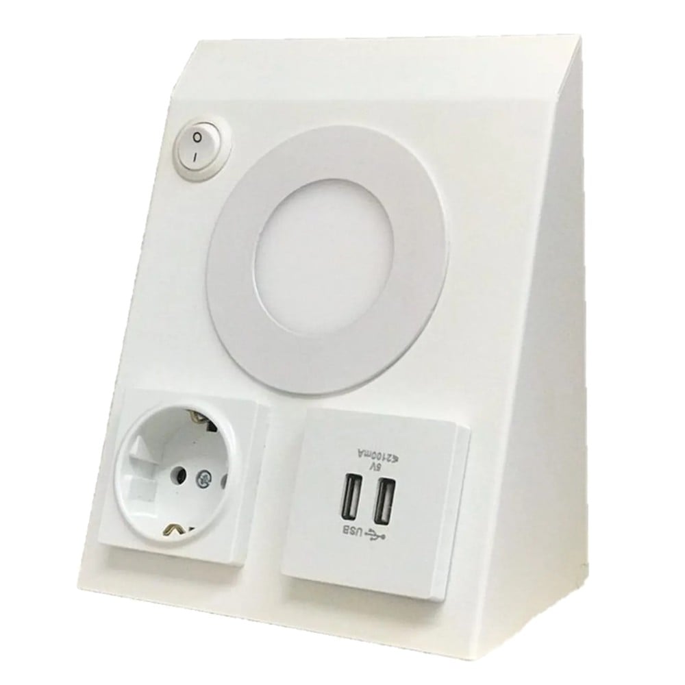 Box with one schuko, 2 usb socket, and cold white light, 17x7.5x14 cm, metalic, white. Suitable to use in your kitchen.