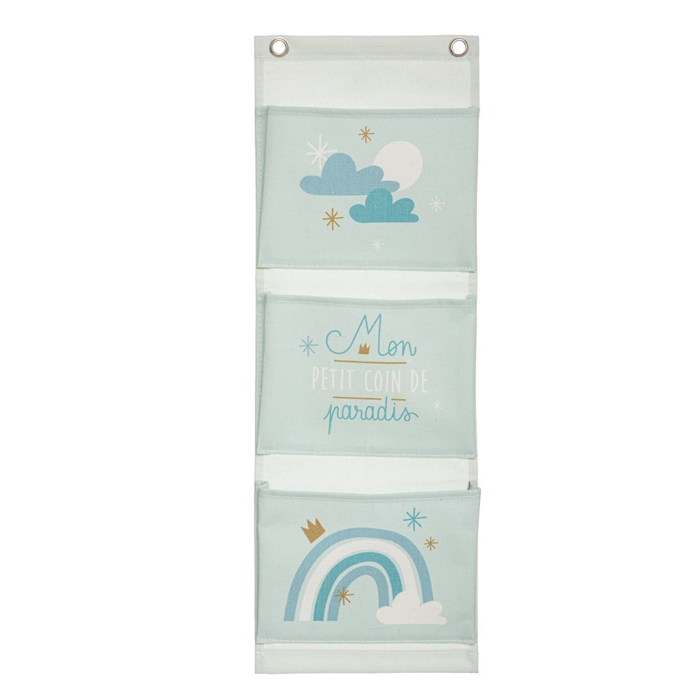Wall storage with 3 vertical partitions. It consists of textile material. Suitable for hanging on the wall. In it you can put socks, small toys, etc. Light blue color