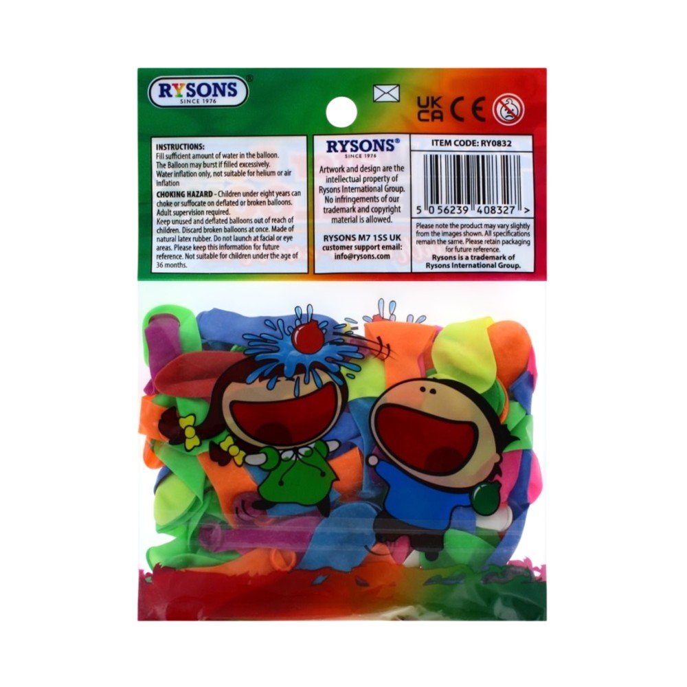 Set of balloons for children, made of latex material, in different colors. They can be filled with water and used by children to play various games outdoors. The material does not contain any toxic or harmful substances for children. The package contains 100 balloons.