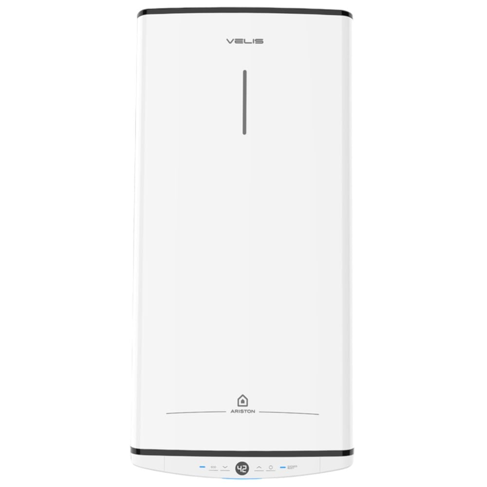 The ARISTON VELIS PRO 80 EU is Ariston’s latest electric water heater, offering an output of 80 liters and a maximum temperature of 80 °C. The first hot shower is ready in just 50 minutes! It operates at a maximum pressure of 8 bar and consumes 1.5 kW of power. With an IPX4 water resistance rating, this unit is ideal for installation in damp environments and provides flexible placement options in various conditions. Designed in Italy, this heater boasts a B energy efficiency rating, highlighting its functionality in reducing energy consumption. A standout feature is its Twin Tank Technology, which allows for up to 16% more hot water availability compared to traditional models. Its ultra-thin design, measuring just 27.5 cm in depth, makes it an ideal solution for installations where space is limited. The heater is equipped with smart features that enhance convenience and safety. It includes an innovative ECO EVO function that learns the user’s habits to better manage the use of the water heater and potentially reduce costs by up to 14%. The SHOWER READY alert notifies users when hot water is available, while additional safety measures, such as the anti-legionella function and ABS safety systems, provide extra protection. The Velis Pro model also features a titanium enamel coating that ensures excellent corrosion resistance, along with a larger magnesium anode for enhanced protection against corrosive elements. The device has a modern and stylish design, with clean lines and elegant finishes that create an aesthetically pleasing and versatile product. The LCD display at the bottom of the heater allows for easy monitoring of temperature and other settings.