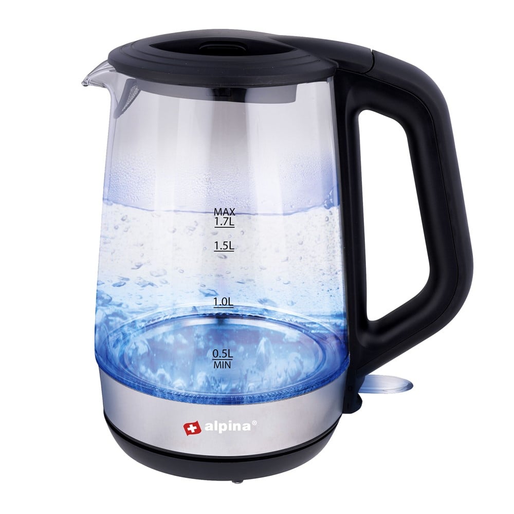 Cordless electric kettle, made of tempered glass and plastic, with a capacity of 1.7 liters, which operates with power 2200 W and voltage 220-240 V. Used for heating and boiling water to prepare tea, soup or other dishes in the kitchen. This product is practical to use and can be easily cleaned.