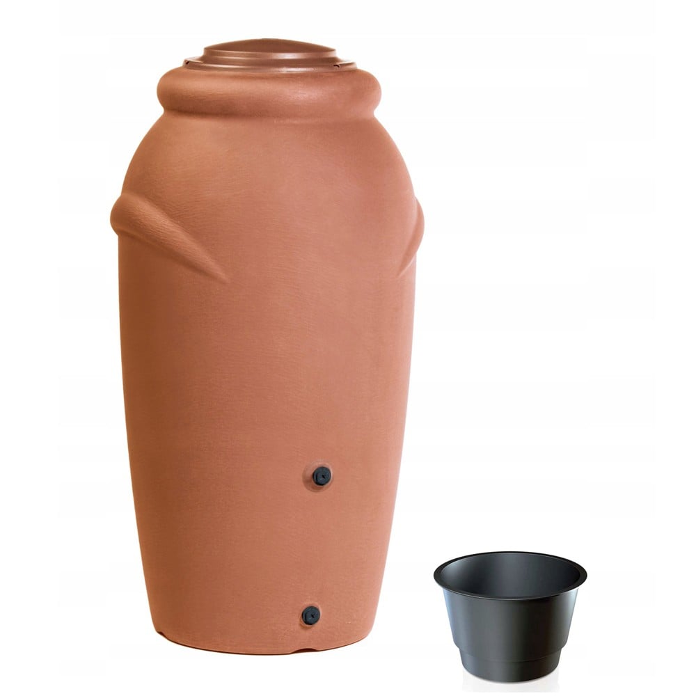 Aqua Tower water tank, with a structure made of plastic material, in terracotta color, with dimensions of 59.6x56x118.3 cm, with a holding capacity of 210 liters. The tank is equipped with an opening with a lid in the upper part, with one place for the possibility of connecting the downspout or other rainwater collecting systems, as well as two threaded openings for the installation of garden hose faucets. The tank is used to collect rainwater and use it in the garden, increasing efficiency in garden maintenance and helping you save money. This product is suitable for use at home environments or various businesses.