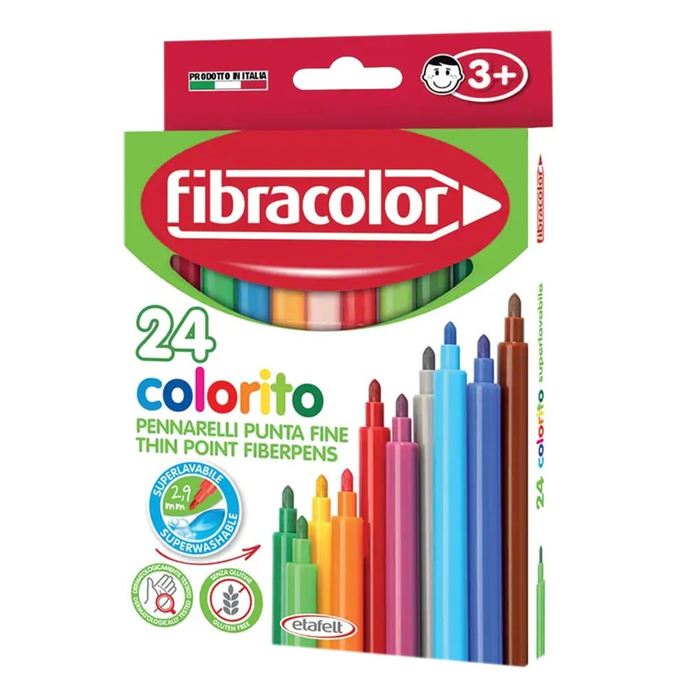 The Fibracolor Colorito set contains 24 markers in vibrant colors and a fine tip (2.6 mm), suitable for detailed drawing, coloring and creative work. The super-washable ink is easily removed from hands with soap and water, as well as from clothes at 40 °C. Suitable for use at school, home or in artistic activities, this set combines quality with practicality and safety for children.