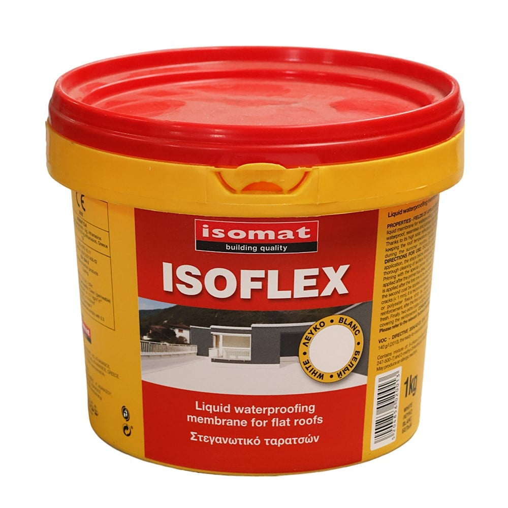 ISOFLEX is a brushable, solvent-free, elastomeric, waterproofing membrane for terraces, offering: Continuous, elastic, waterproof, vaporpermeable sealing layer, without forming seams or joints. Excellent bonding to various substrates like concrete, wood, metal and to any type of waterproofing membranes. High elasticity. High weather resistance and durability. High solar reflectance and infrared thermal emittance, exceeding the energy star requirements. It can lower the roof temperature and help reduce the amount of air conditioning needed. Application possibility also to uneven substrates. It is certified with the CE marking as a coating for surface protection of concrete, according to EN 1504-2. Certificate Nr. 2032-CPD10.11.ISOFLEX is ideal for the waterproofing of terraces, balconies etc. It is also a simple and safe solution for difficult areas (corners, edges, joints between adjacent different materials) and for isolated sealing of cracks. Furthermore, it can be used as a cool roof paint due to its high solar reflectance and infrared thermal emittance.