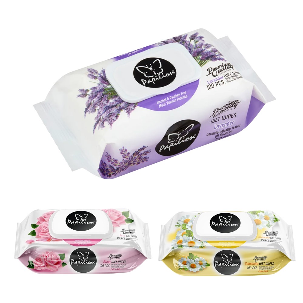 Papilion wet paper is a perfect hygiene product for personal care and daily cleaning. This paper is designed to provide a sense of freshness and comfort, making it ideal for use at home, on the go or in other environments. The wet paper is enriched with natural ingredients such as chamomile, rose and lavender, which provide a pleasant aroma.
