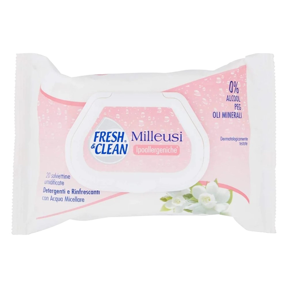 Hypoallergenic Fresh&Clean multi-purpose wet wipes thanks to the micellar water and the composition without alcohol, PEG and mineral oils. They are suitable for cleaning sensitive and delicate skins. The package contains 20 wipes. Dermatologically tested.