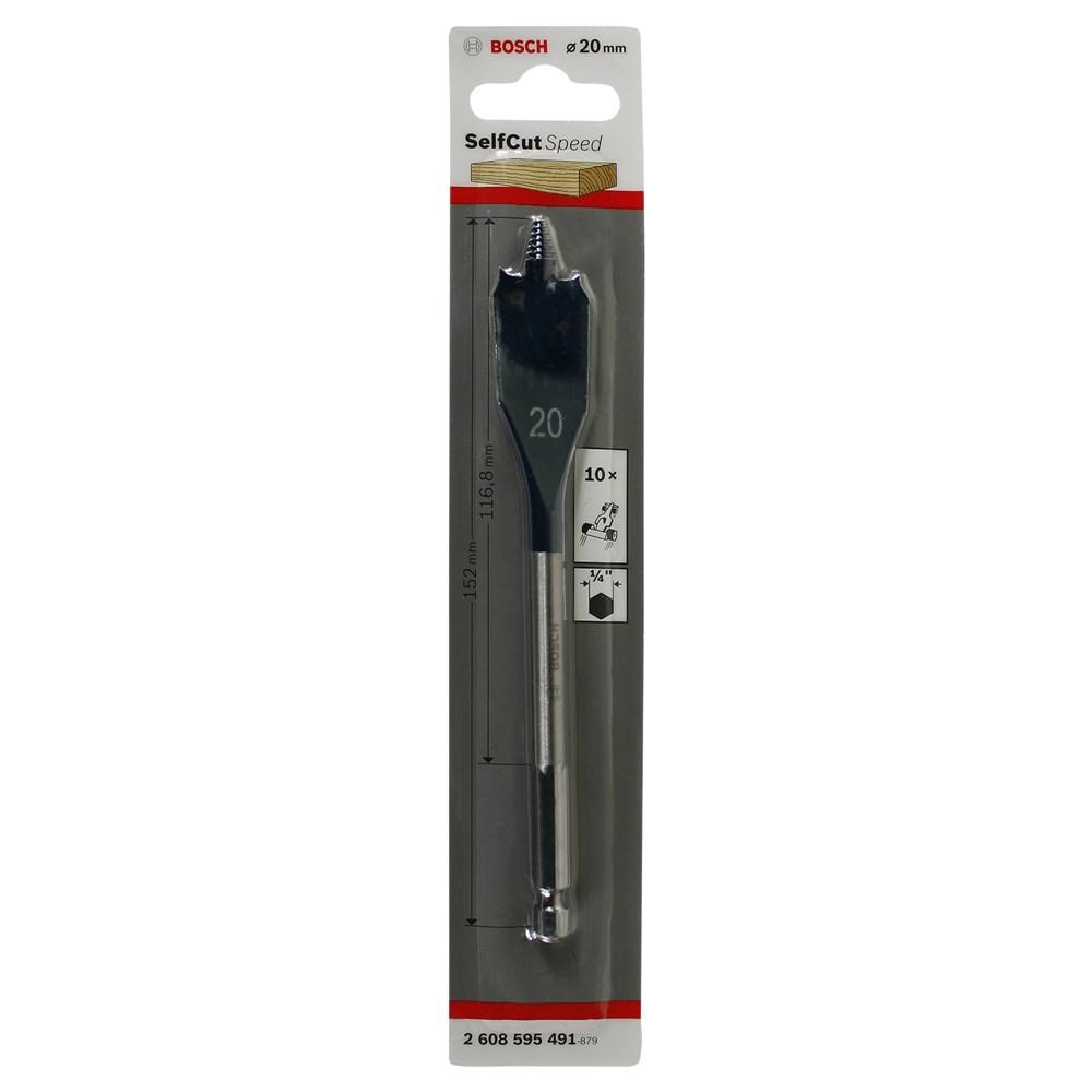 Suitable for soft and hard wood, light building material and plasterboard. Drills three times as fast as standard spade bits. Patent pending, self feeding threaded tip and cutting geometry. Manufactured in accordance with own factory standards from specially toughened steel. Precision ground tip and cutting edges for accurate dimensional stability when drilling. Shank with 1/4" hexagon socket manufactured to DIN 3126 - E 6.3. Innovative self-feeding threaded tip for fast and accurate drilling with little exertion of force