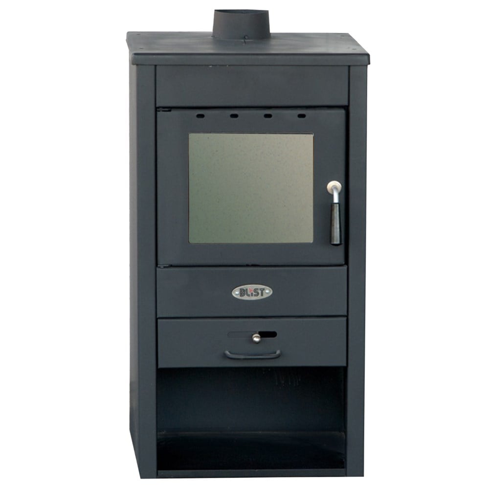 BLIST solid fuel stoves are designed in a way to enable efficient combustion of solid fuels with the possibility of adjusting and regulating the amount of input air required for the combustion process. The stove consists of parts from steel, with doors and top plate made of cast iron or steel (depending on the model of the stove), and the grate in the combustion chamber made of cast iron. All stoves are plated inside with schamotte bricks, which provides long-term heat accumulation. The stoves are painted with special heat resistant paint. The glass on the door is the first class heat resistant ceramic glass.The stoves are designed for space heating of a wide spectrum such as living rooms, offices, restaurants, schools, garages, warehouses, etc.The glass must not be cleaned with wet cloth nor sprinkled with water when is hot. Otherwise, the glass may crack. Very cold objects should not be placed on the top plate when is hot. Otherwise the top plate may crack. Do not use alcohol, petrol or any other liquid fuel. Some parts of the stove can reach very high temperatures during operation the stove,thus it is required adequate precaution while using the stove. Do not allow children to handle and play near the stove.It is made up of a 16 liter bolier and normal output to water 8-10 kw.