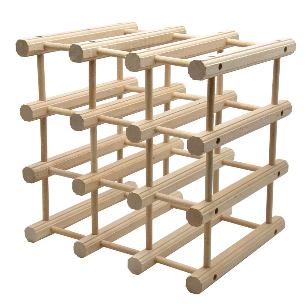 Square bottle holders, made of wood. the holder has 9 places to hold the bottle.
