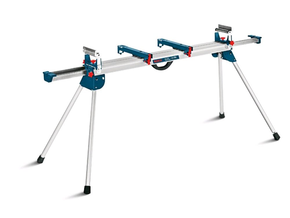 Bosch GTA 3800 flexible mitre saw. Strong and durable design. Low weight made from aluminium. Workpiece support with rollers. Easy to transport with carrying handle. Universal mounts allowing the stand to accept saws from Bosch, Dewalt, Metabo, Makita and Festool. Maximum load 250 kg. Length of extensions one-way 3700mm