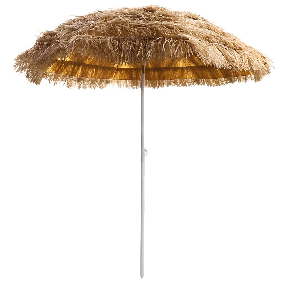 Built of solid metal structure. Recordable by locking mechanism. Modeled with straw fibers to provide an exotic atmosphere, which goes best with wooden furniture and chaise longues. Suitable for beach, pool and outdoor decoration. The stable structure of the frame makes it resistant to light shadows. The cover guarantees protection against the sun's radiation. The umbrella is compatible with plastic and concrete bases.
