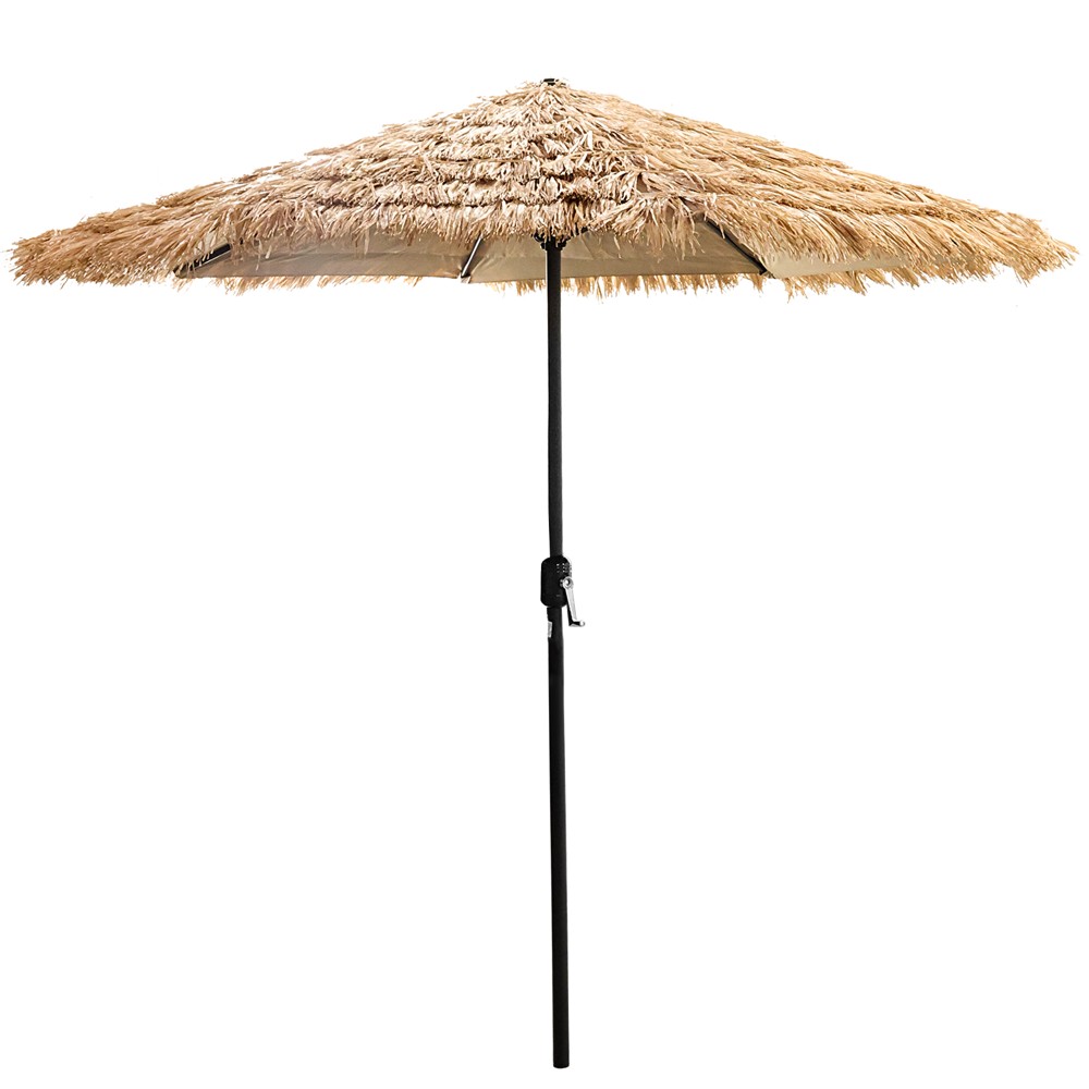 Designed by solid structure and jack mechanism for ease of operation. Modeled with straw fibers to provide an exotic atmosphere, which goes best with wooden furniture and chaise longues. The stable structure of the frame makes it resistant to light shadows. The cover guarantees protection against the sun's radiation. The umbrella is compatible with plastic and concrete bases.