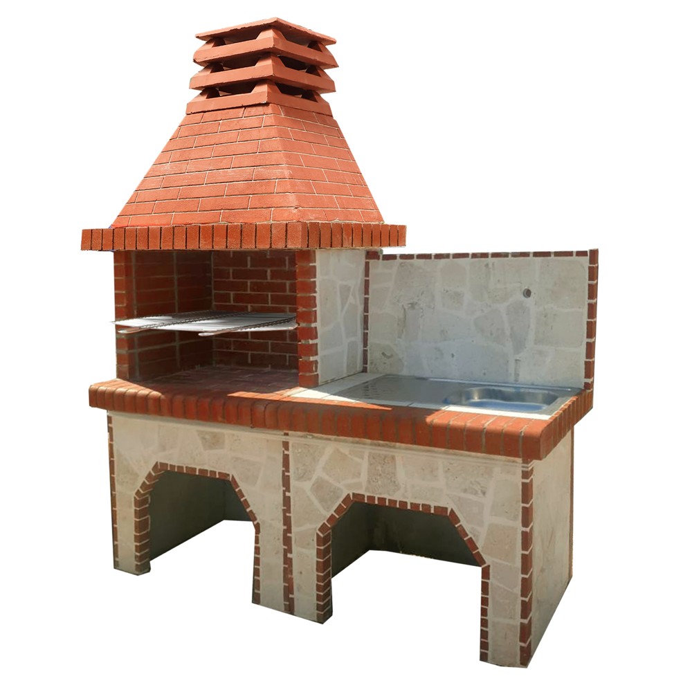 Barbekju betoni me dekor guri dhe lavaman, prej 215x185x60 cm. E ndërtuar prej betoni dhe e trajtur me solucion zjarrdurues. E pajisur me pozicione lartësie për të vendosur zgarën për pjekje. E projektuar me hapësire për të pozicionuar aksesorë të ndryshëm barbekjuje dhe te pajisur me banko dhe lavaman. Blloku i ngritjes së oxhakut nuk përfshihet. Nevojitet montim.