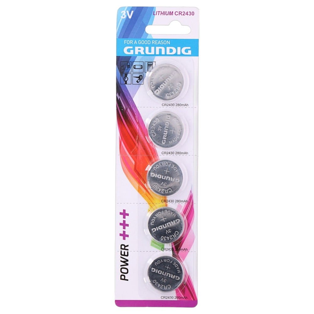 Kjo bateri litiumi CR2430 (e pakarikushme) nga Grundig përdoret shpesh në peshore, detektorë tymi, matës të glukozës, monitorë të rrahjeve të zemrës, pajisje "click on click off" dhe për çelësa makinash. Bateritë CR2430 kanë një diametër prej 24 mm dhe janë 3.0 mm të trasha. Ky set përmban 5 bateri CR2430.