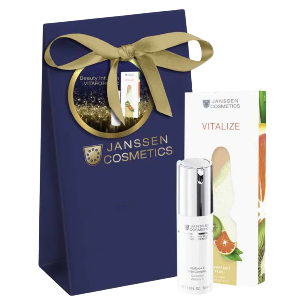 seti i dhuratave përbëhet nga ampula VITALIZE – Superfruit Fluid 7 x 2 ml, Vitaforce C Skin Complex 30 ml dhe 2 thasë me krem ​​Vitaforce C.