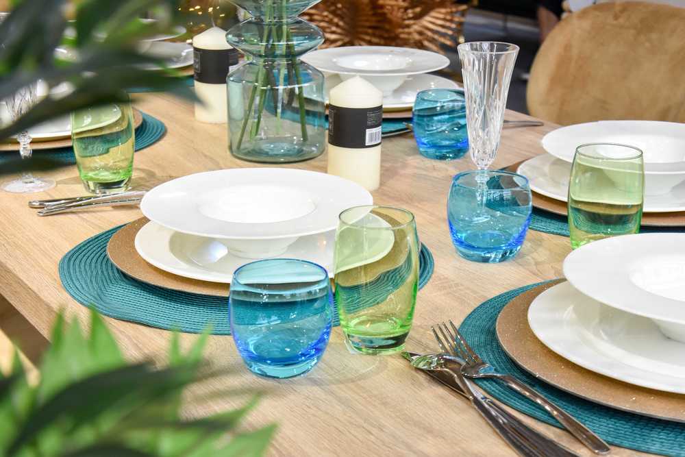 Në vend të një mbulese tavoline të madhe, vendosëm të linim pakëz hapësirë për drurin natyral që të duket, dhe përdorëm shtrojet plot ngjyrë rrumbullake, të cilat theksojnë akoma më tepër formën e pastër të pjatave. Por përveç shtrojeve, një nga detajet që bie më shumë në sy në tavolinë janë padyshim gotat e ujit apo lëngjeve, të cilat plotësojnë tavolinën plot ngjyrë dhe freski verore.