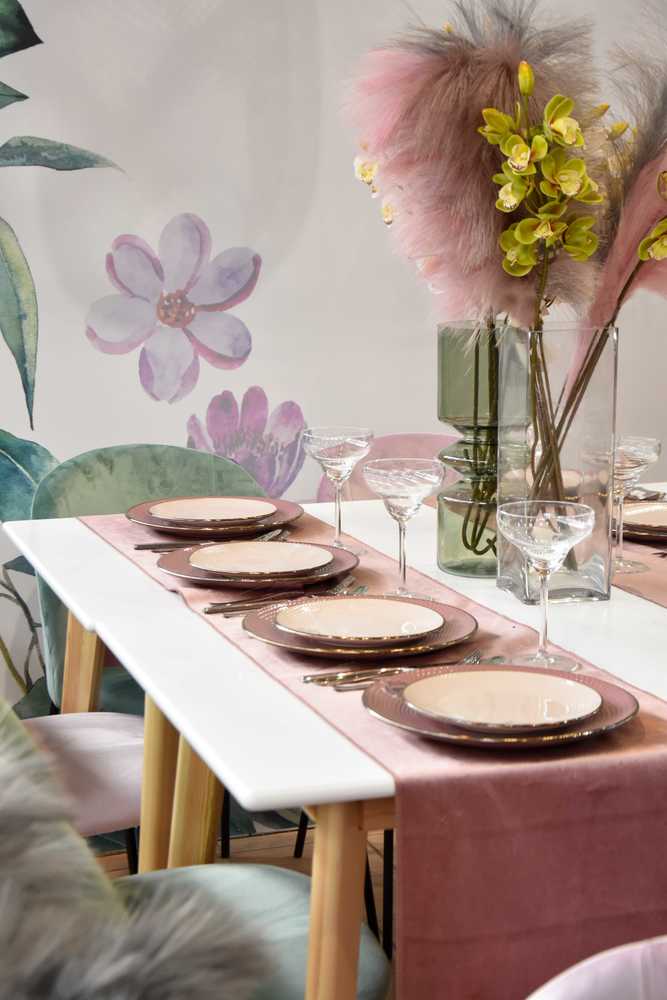 Nëse përgjithësisht ju pëlqejnë ngjyrat e lehta pastel të rozës, ky shtrim tavoline është zgjedhja perfekte për vakte elegante dhe plot stil! Duke qenë se ngjyrat e përzgjedhura për shtrimin e tavolinës janë të çelura, ata kërkojnë një tavolinë të bardhë apo ngjyrë të hapur druri për të krijuar një kontrast të këndshëm. Mbi një sipërfaqe të bardhë, të gjitha elementët e servirjes shndërrijnë duke i bërë dhe materialet të duken akoma dhe më shumë elegante.