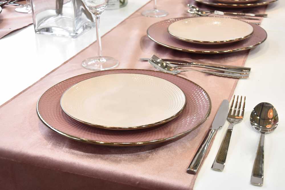 Për këtë tavolinë kemi vendosur të përdorim ngjyra të ngjashme për të krijuar një rregullsi të këndshme për syrin. Shtroja e përdorur ka një teksturë luksoze velveti, e cila përshtatet më së miri me pjatat rozë, të cilat rrethohen nga një ngjyrë e butë e florinjtë. Lugët, pirunjtë dhe thikat janë përzgjedhur sa më minimaliste në stil, për t’i lënë hapësirë gotave të kokteileve të bien në sy.