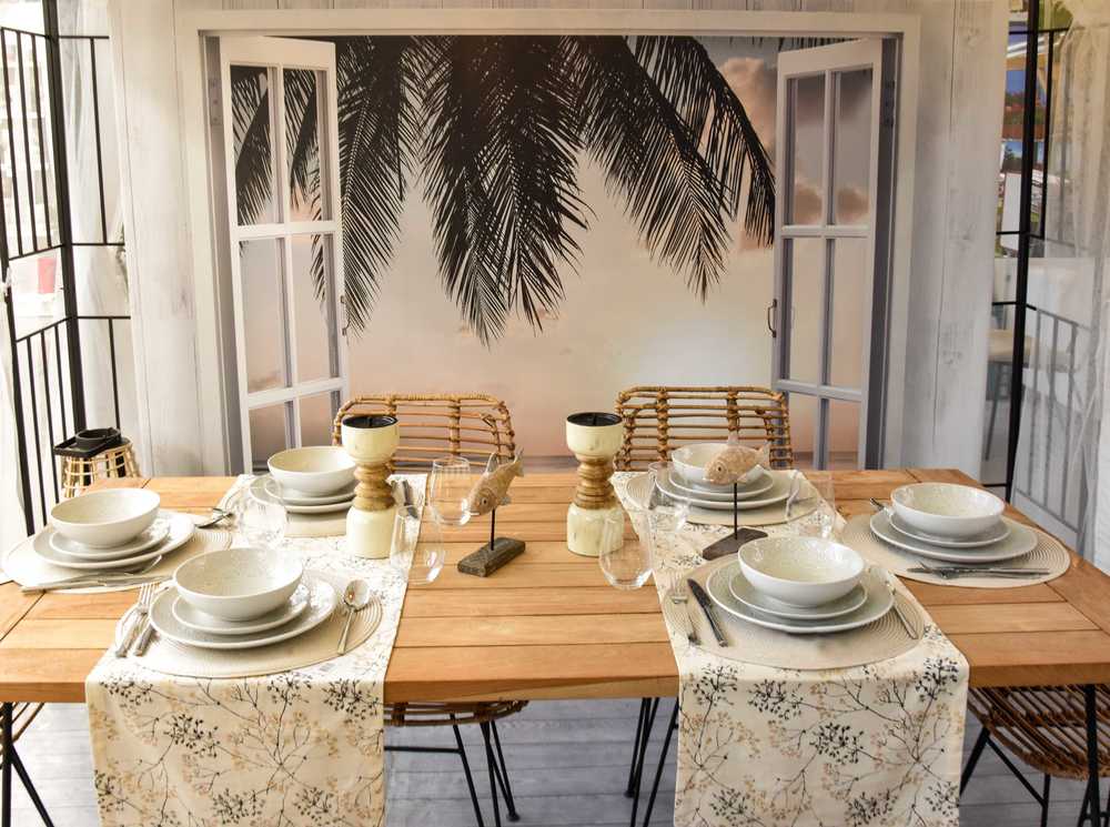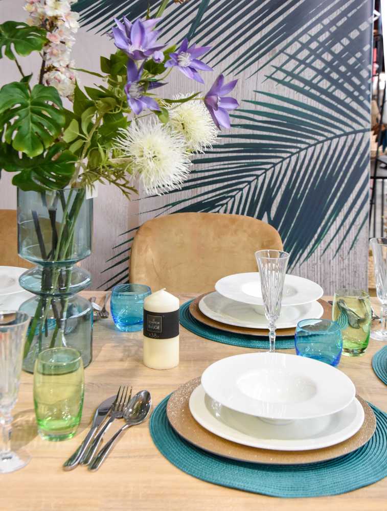 Lulet e përzgjedhura në mes të tavolinës krijojnë harmoni të këndshme mes ngjyrave tropikale të gotave dhe shtrojeve me aksesorët e tjerë të tavolinës të cilët shkëlqejnë nga materialet e përzgjedhura. Kështu gjithçka duket e balancuar, plot jetë dhe gati për të servirur recetat e tua të preferuara!