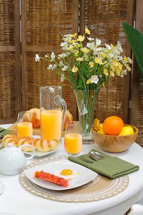 Gjithçka u bë shumë e bardhë? Shtojini ngjyra tavolinës përmes shtrojeve, të cilat mund ti kombinoni fare thjesht me elementet e drurit si prerësja e bukës, apo dhe tasi i frutave prej bambuje.
