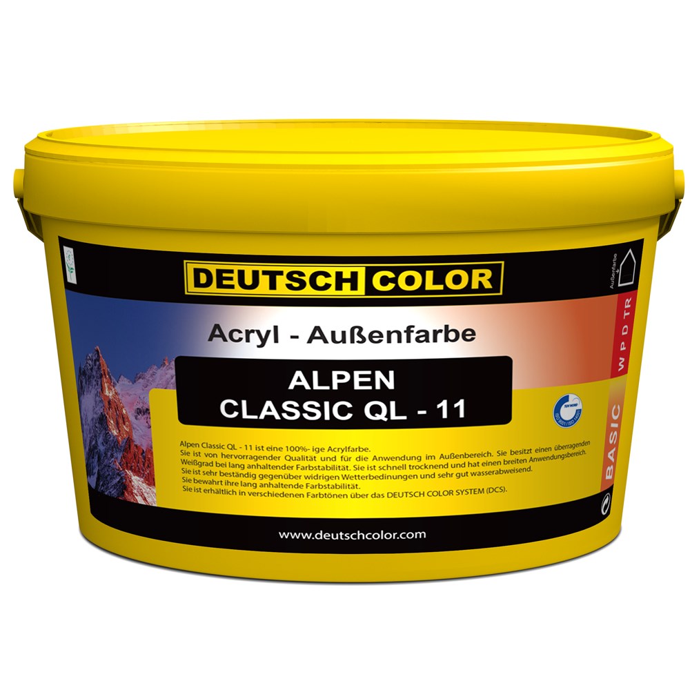 Alpen Classic QL 11 është bojë akrilike me cilësi të shkëlqyera për përdorim të jashtëm. Zotëron punueshmëri dhe aftësi niveluese shumë të mira, ngjitje të fortë dhe tharje të shpejtë.Pas aplikimit, rezultati është një rifiniturë mat me rezistencë tepër të mirë ndaj ujit dhe agjentëve të ndryshëm atmosferikë.