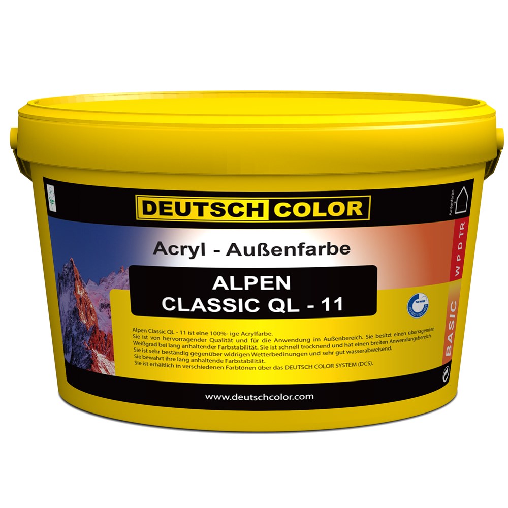 Alpen Classic QL 11 është bojë akrilike me cilësi të shkëlqyera për përdorim të jashtëm. Zotëron punueshmëri dhe aftësi niveluese shumë të mira, ngjitje të fortë dhe tharje të shpejtë.Pas aplikimit, rezultati është një rifiniturë mat me rezistencë tepër të mirë ndaj ujit dhe agjentëve të ndryshëm atmosferikë.