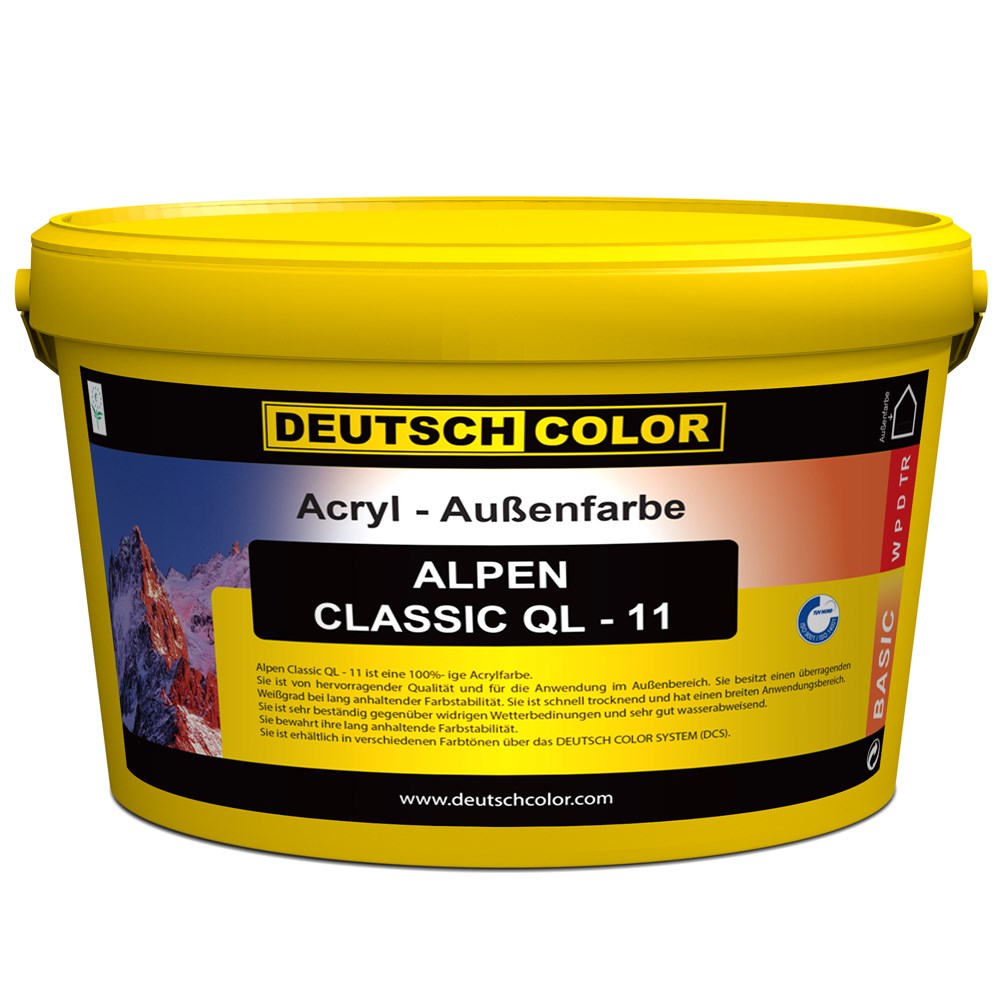Alpen Classic QL 11 është bojë akrilike me cilësi të shkëlqyera për përdorim të jashtëm. Zotëron punueshmëri dhe aftësi niveluese shumë të mira, ngjitje të fortë dhe tharje të shpejtë.Pas aplikimit, rezultati është një rifiniturë mat me rezistencë tepër të mirë ndaj ujit dhe agjentëve të ndryshëm atmosferikë.