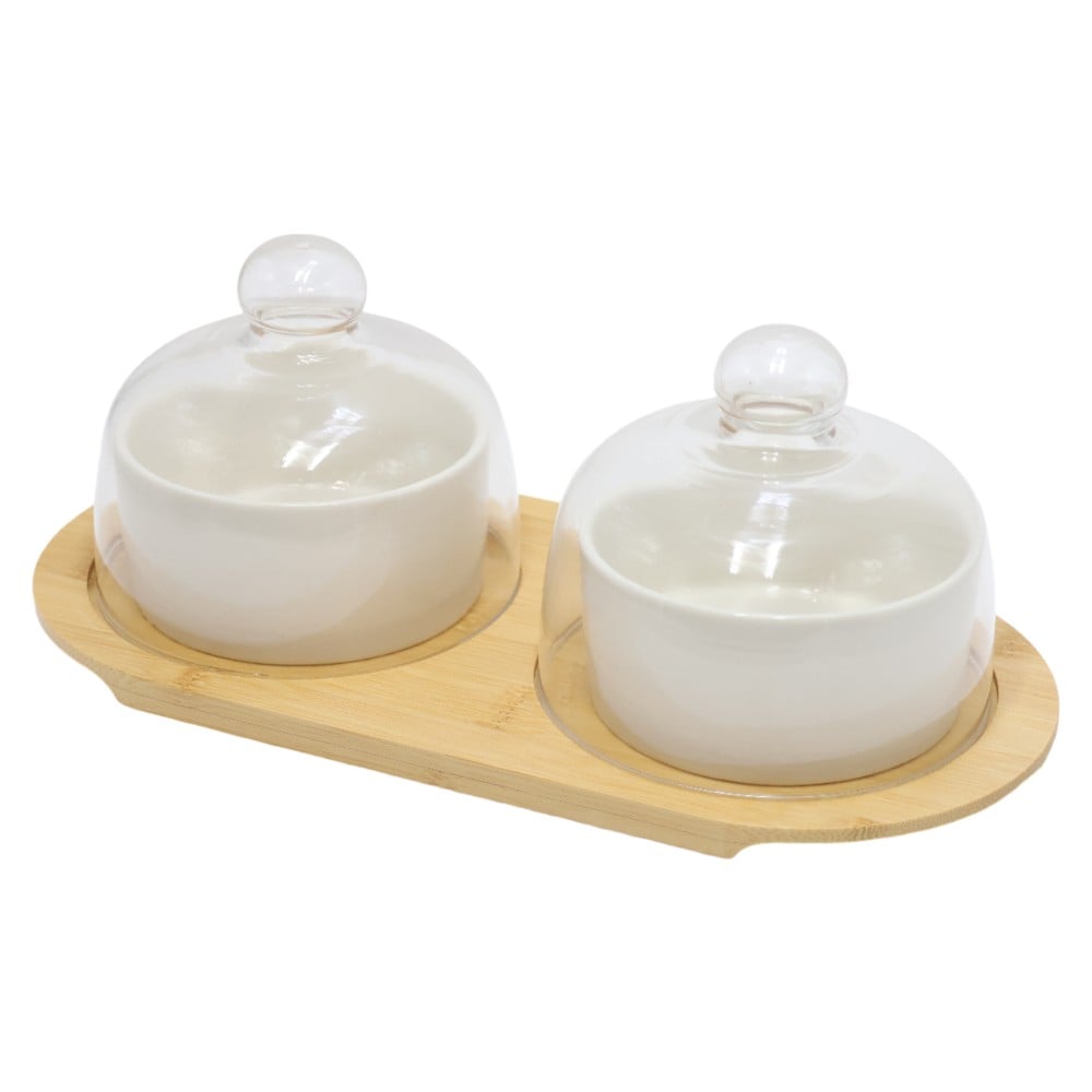 Set prej dy bombonjerash ose mbajtësash për biskota, të realizuara nga qelqi dhe bambu, në ngjyrat transparente dhe kafe. Seti është elegant, duke ofruar një prezantim tërheqës për ëmbëlsira ose biskota.