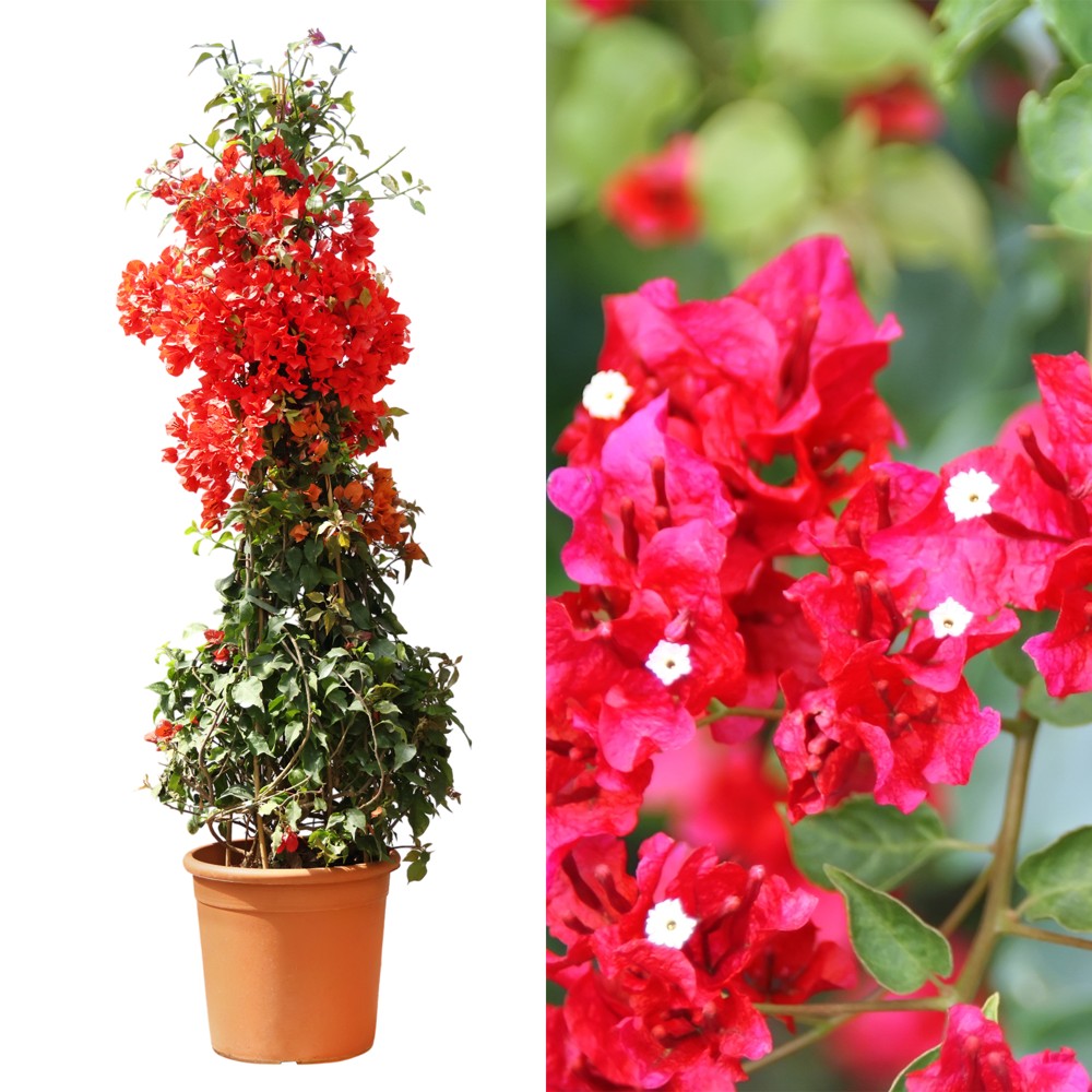 Bougainvillea është një bimë me gjelbërim të përhershëm me ngjyra të dukshme dhe spektakolare. Lulet vijnë në një gamë të madhe ngjyrash duke përfshirë vjollcën, vjollcën, rozën, kajsinë, të kuqe, të verdhë dhe të bardhë. Ato janë në fakt të mëdha të holla letre që rrethojnë një grup qendror lulesh të vërteta, të cilat janë me ngjyrë të vogël dhe të bardhë. Kushtet e rritjes pa ngrica janë thelbësore për bougainvillea. Ato mund të prodhojnë lulëzime të përsëritura për shumë muaj nëse kushtet janë të përshtatshme. Bougainvilleas shiten shpesh si bimë shtëpie, zakonisht të kapura rreth një rrethi teli ose në një kornizë, por ato mund të rriten edhe si një shkurre, lart një mur ose mbi një hark. Nga natyra, ato kanë nevojë për shumë hapësirë për tu rritur dhe mund të arrijnë lehtësisht dy metra lartësi. Varietetet kompakte të bougainvillea janë në dispozicion ato rriten deri në një metër të lartë dhe funksionojnë mirë si shkurre ose mund të mbillen edhe në një shportë të varur.