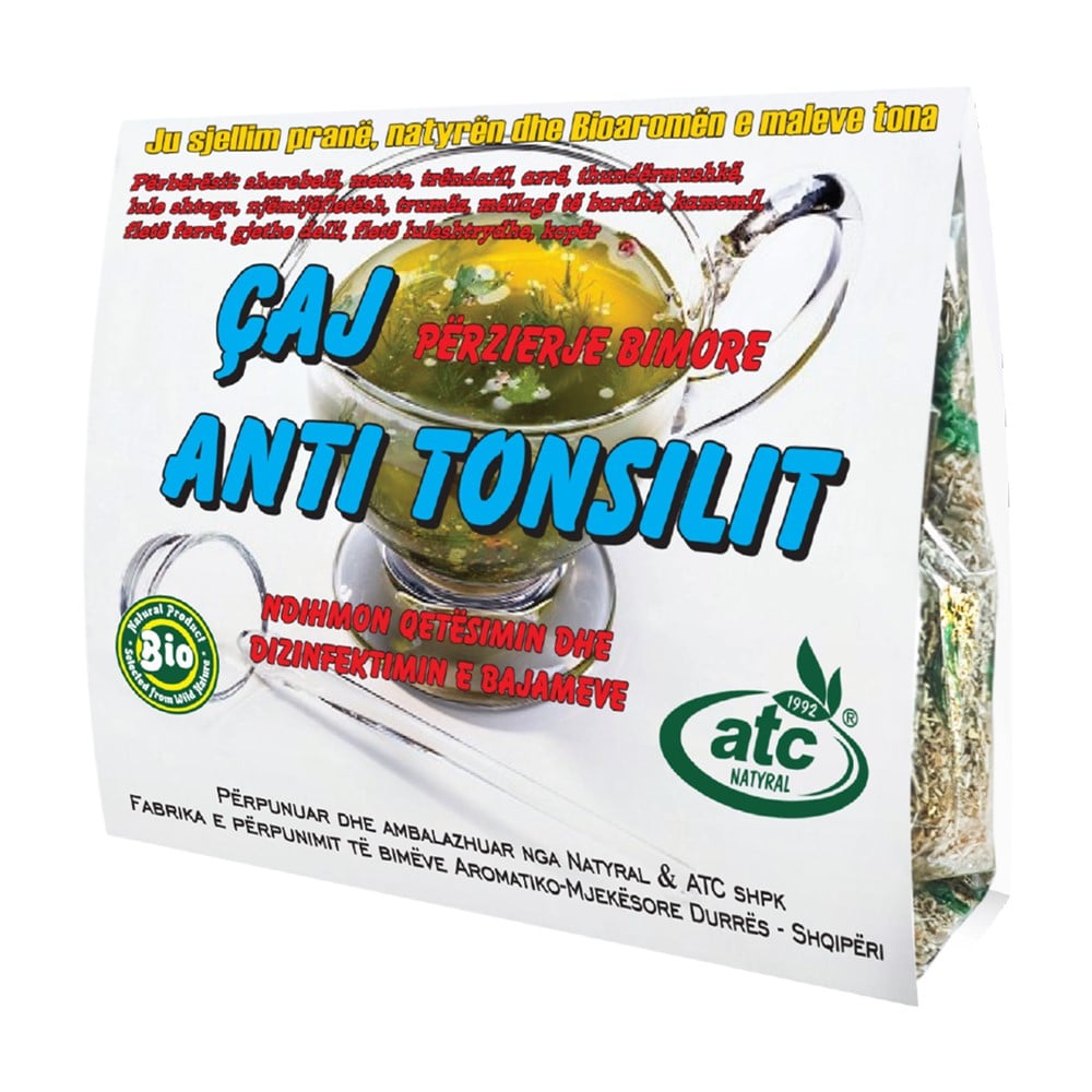 Çaj bimor anti-tonsilit (infeksioni i bajameve), me një formulë të pasuruar me ekstrakte bimore të mentes, sherebelës, trumzës, luleve të kamomilit, koprës, luleshtrydhes, manaferrave, arrës, ekstrakt të trëndafilit të egër, shtogut, njëmijëfletëshit dhe mëllagës. Ekstraktet e pasura bimore, në sajë të vitaminës C, vitaminës K dhe P, tanineve, esencave dhe substancave të tjera aktive që ato përmbajnë, kanë veti frenuese dhe dizifektuese për infeksionet e zakonshme dhe kronike të fytit, kanë aftësi qetësuese ndaj stresit, mbrojnë zemrën duke ulur kolesterolin në gjak, shërbejnë si një katalizator për shërimin e shpejtë nga të ftohtët, kundër bronkitit dhe laringitit, si dhe në mbrojtjen e imunitetit të organizmit, veprojnë tek tiroidet dhe paratiroidet, kanë aftësi dezinfektuese dhe zbutëse, janë antiflamatore të acarimit të fytit dhe gojës dhe veprojnë kundër pezmatimit të rrugëve të frymëmarrjes dhe të fytit duke lehtësuar nxjerrjen e gëlbazës (mukusit).