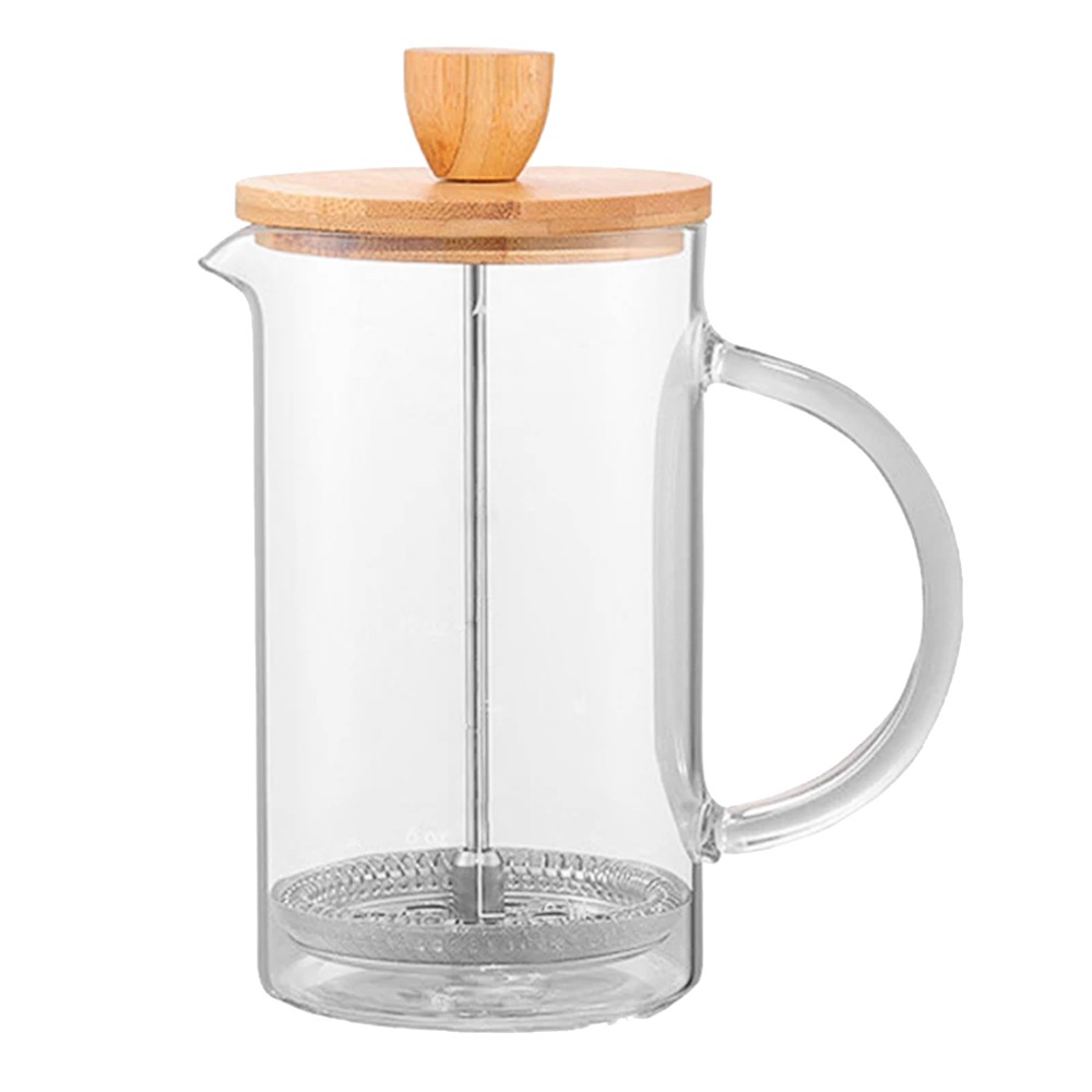 Çajniku me shtypje, i disponueshëm në materialin qelqi ose bambu, është transparent dhe ka një lartësi prej 15.5 cm, me një kapacitet prej 600 ml. Ky çajnik ofron një zgjedhje të shkëlqyer për përgatitjen e çajit në mënyrë të thjeshtë dhe të shpejtë. Dizajni transparent i tij lejon përdoruesin të shohë nivelin e lëngut brenda çajnikut, duke e bërë të lehtë të kontrollohet sasia e çajit. Materialet qelqi ose bambu e bëjnë atë të qëndrueshëm dhe të përshtatshëm për përdorim të përditshëm. Shtypja e çajit është një metodë e shpejtë dhe e thjeshtë për të përftuar një çaj të freskët dhe të shijshëm.