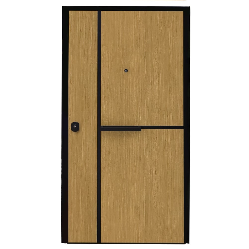 Kjo derë e blinduar për ambjente të jashtme është kombinim i funksionales me estetikën. Dera ka stilin dhe bukurinë që ju dëshironi për shtëpinë ose zyrën tuaj. Ajo mund të mbrojë familjen dhe pronën tuaj nga vjedhjet falë përbërjes që ka. Paneli i brëndshem i derës është me fletë të galvanizuar si dhe ka barriera celiku të ndërmjetme. Ka kundra bravë, Bravë me 3 pistona, sy magjik, MDF 8mm dhe shul të sipërm