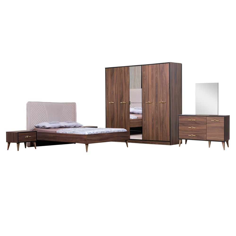 Dhoma e gjumit ''Elegancë'' ofron një kombinim të shkëlqyer të stilit modern, funksionalitetit dhe përshtatshmërisë, duke krijuar një ambient të mrekullueshëm dhe të rehatshëm për relaksimin dhe gjumin. Kjo dhomë gjumi është e përbëre nga; 1- Dollap rrobash me 5 kanate-210x58xH210 cm. Ky dollap rrobash me përmasat e tij të bollshme ofron një hapësirë të mjaftueshme për ruajtjen dhe organizimin e veshjeve dhe rrobave tuaja. 2-Komo; 120x45xH79 cm. E dizajnuar me një pamje moderne dhe tërheqëse me stilin e dhomës së gjumit, 3-Pasqyra; 60.4x22xH80 cm. Një pasqyrë elegante dhe moderne me një përfundim perfekt e përshtatur për dhomën e gjumit. 4- Komodinë; 120x45xH79 cm. Dizajnuar me kujdes për tu përshtatur me dhomën e gjumit, ofron një hapësirë shtesë për ruajtjen dhe organizimin e veshjeve dhe sendeve tuaja në dhomën e gjumit. 5- Krevat dopjo; 175.6x215.2xH115 cm. Krevati dopjo ofron qetësinë dhe rehatinë e kërkuar nga të gjithë ne pas një dite të lodhshme pune . Konstruktuar me një strukturë të qëndrueshme dhe dizajn tërheqës të përputhur me stilin e dhomës së gjumit Brooklyn.
