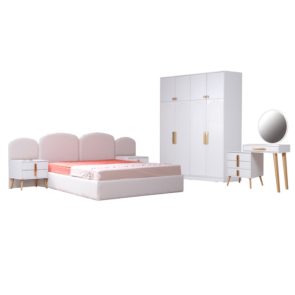 Ky set dhomë gjumi ''Juliette'' është një zgjedhje e shkëlqyer për të përmirësuar ambientin tuaj të gjumit me një stil të rafinuar dhe funksionalitet të lartë. Dhoma e gjumit set është e përbërë nga ; Dollapi me 4-kanata me dimension (184x60x230 cm); 1 Komo (120x45x84 cm); Pasqyrë (68x68x22 cm); Komodinë (60X45X50cm); Krevat dopjo (308x215x105 cm). Ky komplekt është një zgjidhje e plotë për mobilimin e dhomës së gjumit, i cili karakterizohet me cilësitë e shkëlqyera të mobiljeve të tij. Materialet e përdorur për këtë set përfshijnë melaminë e cilësisë së lartë për një strukturë fortë dhe të qëndrueshme dhe tapiceri tekstili në ngjyrën e bardhë për një pamje të pastër, elegante dhe tërheqëse. Garderoba ka shpërndarje funksionale dhe praktike, gjë e cila ofron mbajtjen e rrobave dhe të çarçafëve në mëmyrën më të mirë të mundshme.