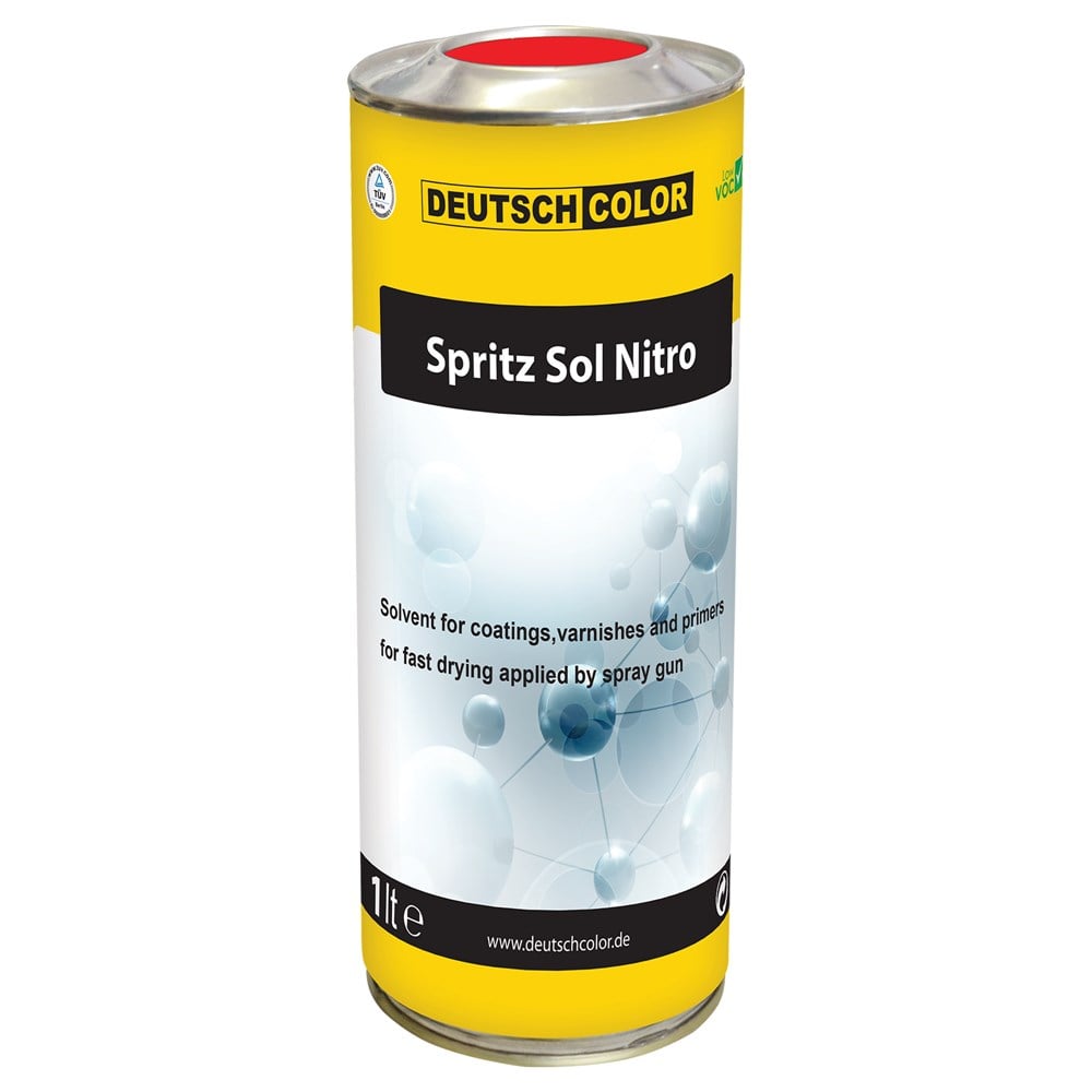 Spritz Sol Nitro eshte nje solvent per bojera dhe primera.Eshte nje produkt transparent ,me nje ere karakteristike te solventeve organike dhe hidrokarboneve aromatike.Eshte e pershtatshme per te holluar primerat dhe zmaltot me tharje te shpejte per aplikimet me pistolete.