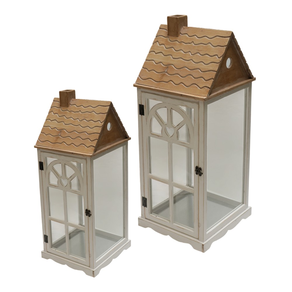 Fener dekorativ, set 2 copë, metalike/druri, e bardhë/natyrale
